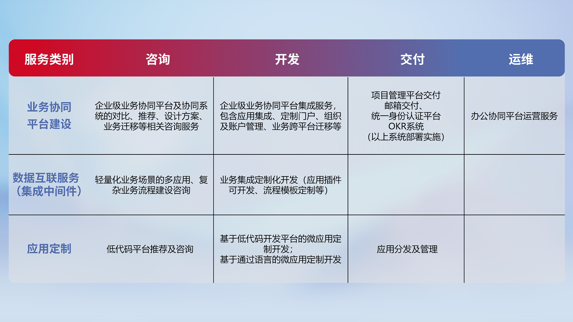 针对钉钉、、、企微、、IDaas等平台级产品提供产品的规划、、、、方案、、、交付、、、、定制化开发等服务,,,实现如统一协同办公、、智能客户服务、、、混合会议管理、、智能数据查询、、、、等业务场景,,实现数字化转型。。